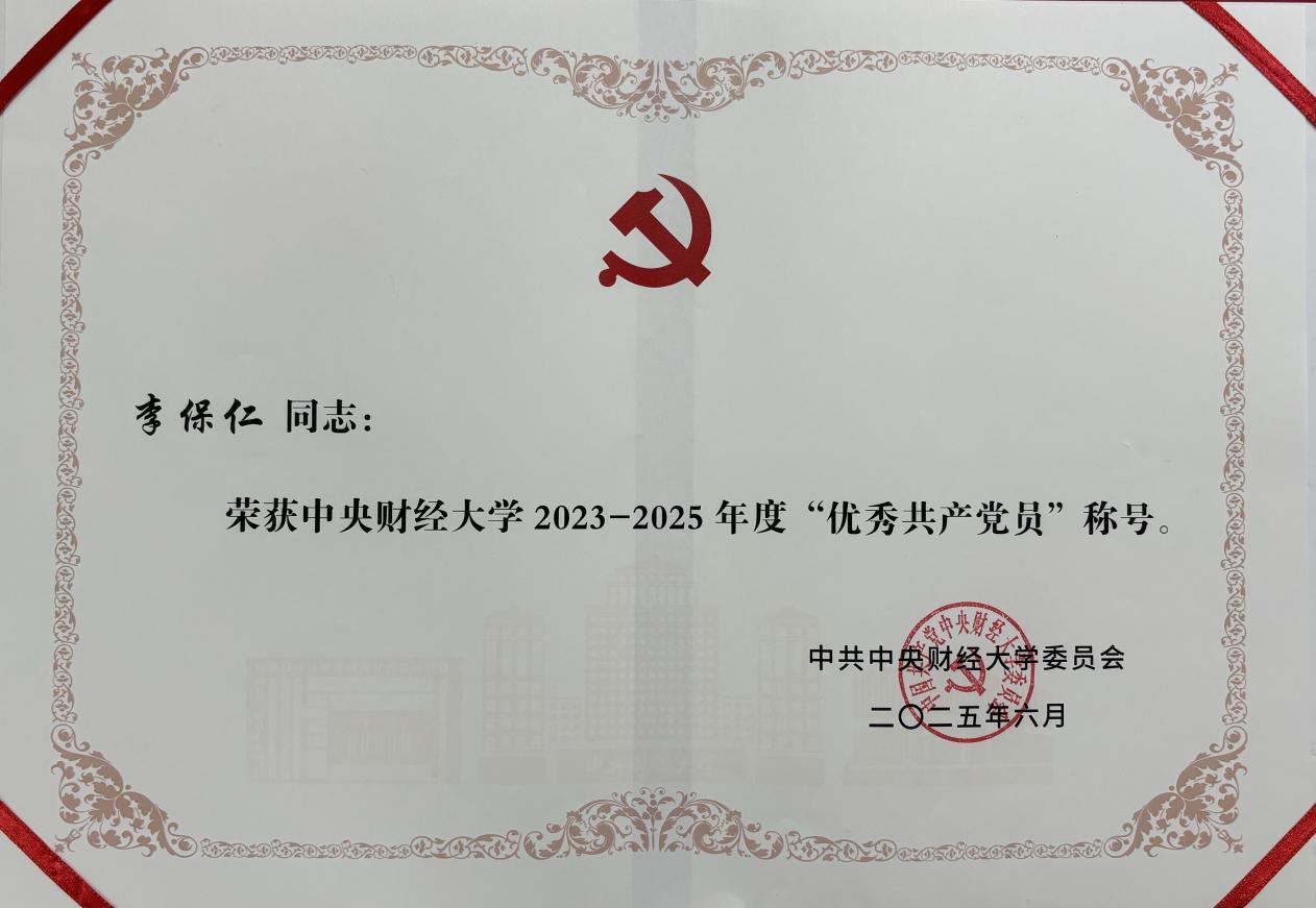 李保仁同志荣获中央财经大学2023-2025年度“优秀共产党员”、“优秀共产党员标兵”