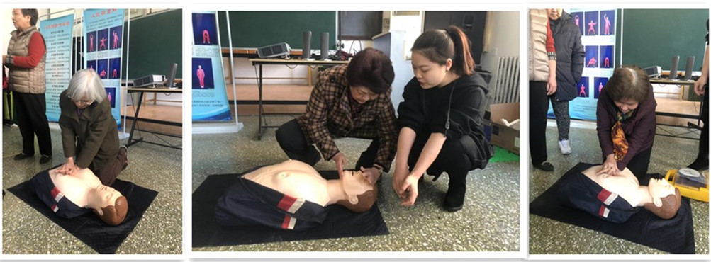 讲座最后,刘主任利用实物模型为大家演示了除颤仪的使用方法及实施心肺复苏的操作手法。我校老同志认真观察刘主任的操作步骤,并利用模型亲自实施心肺复苏操作,请刘主任从旁指点。