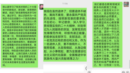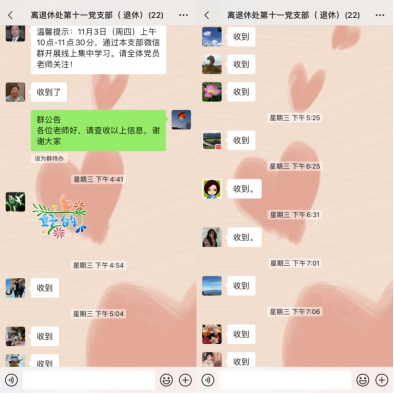 11月3日上午,离退休人员工作处党总支第十一党支部(退休)通过支部微信群召开线上学习会,深入学习贯彻党的二十大精神。此次学习会由支部书记张凤阁主持。