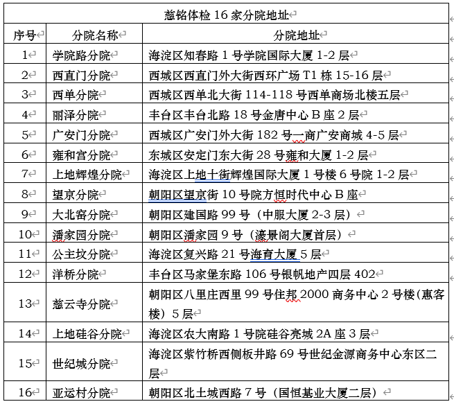 三、体检地点:慈铭体检中心北京地区16家体检分院